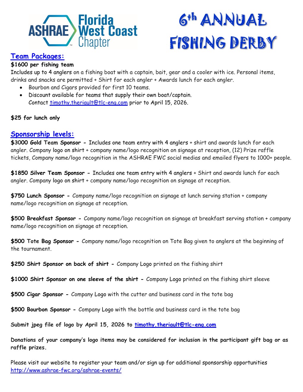 Includes one team entry with 4 anglers + shirt and awards lunch for each angler. Company logo on shirt + company name/logo recognition on signage at reception. (12) Price raffle tickets, Company name/logo recognition in the ASHRAE FWC social medias and emailed flyers to 1000+ people.